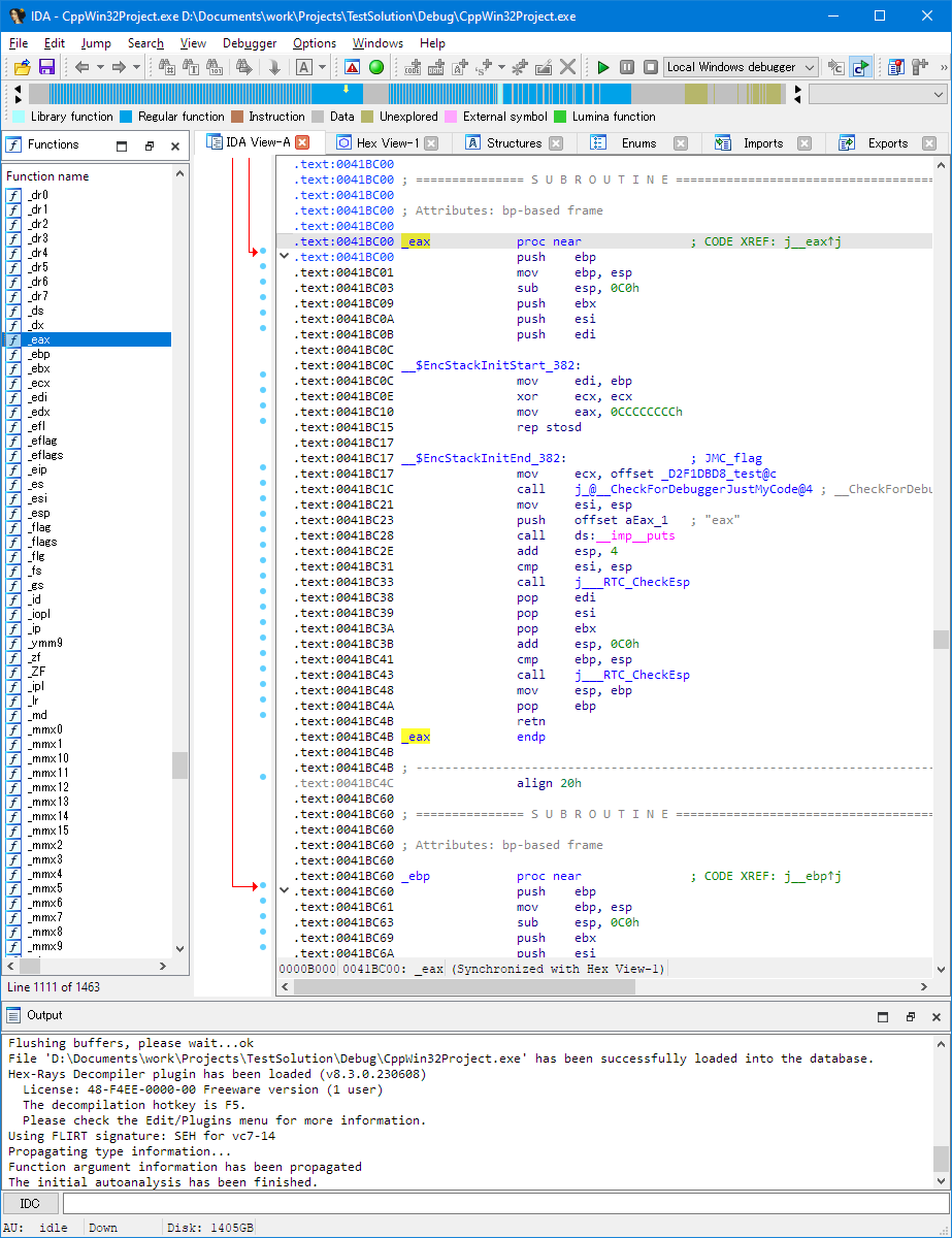 確認してみると、少なくともx64 PEの場合やx86/x64 ELFの場合は、eax等の一部レジスタ名と同一であるシンボル名(=関数名やグローバル変数名)について、IDAは無視しました。なお、x86 PEの場合はビルド結果のPDB中のシンボル名が先頭にアンダースコアの付いた_eax等のシンボル名になってしまったため、結果は不明です。